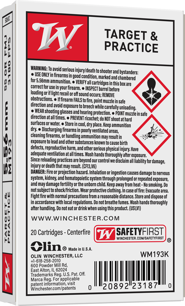 5.56mm 55 Grain M193 FMJ Winchester 20/BOX